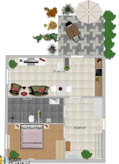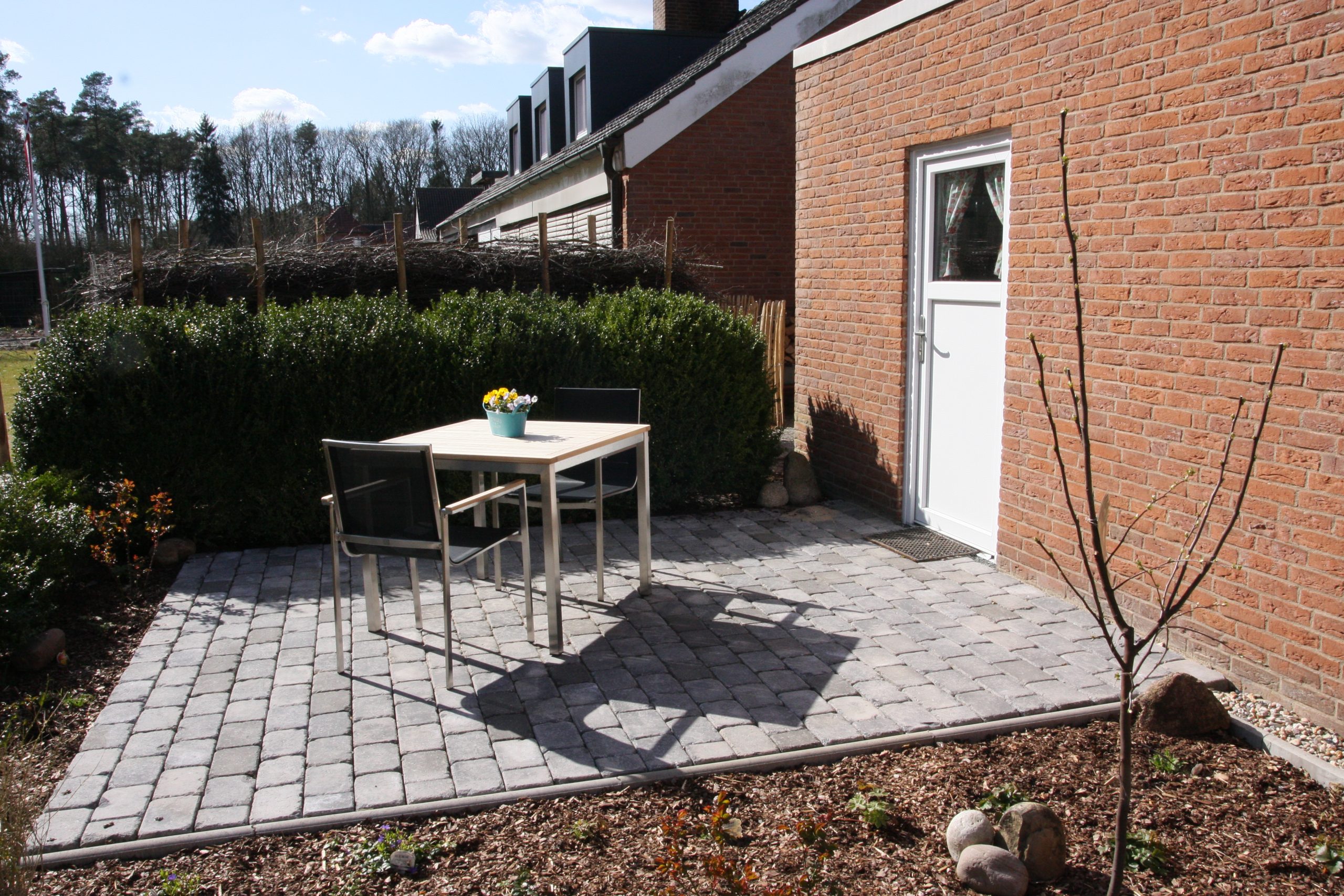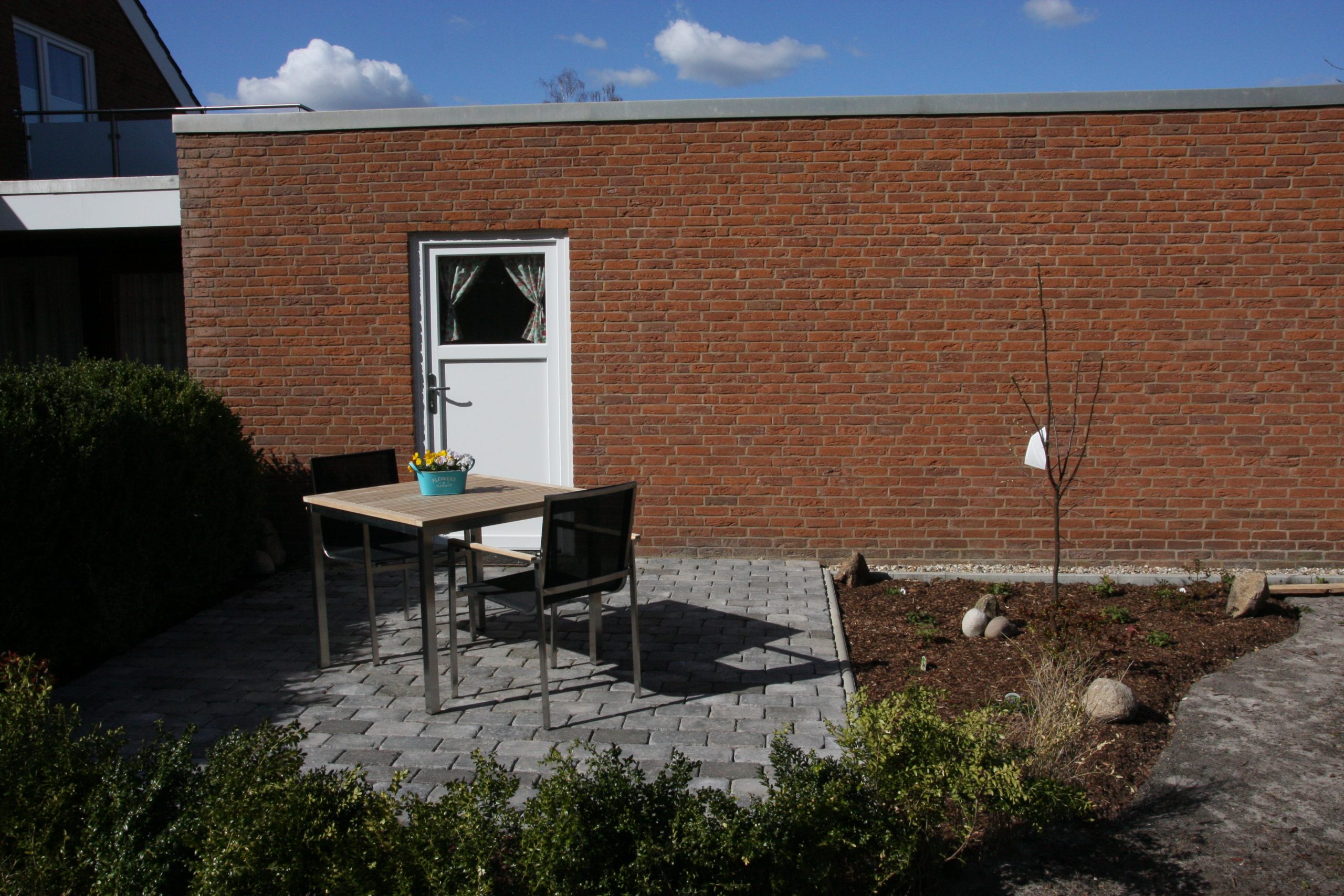 Von dort gelangen Sie auf Ihre eigene Terrasse, die mit Gartenmöbeln und Sonnenschirm ausgestattet ist. Was gibt es Schöneres, als einen Urlaubstag mit einem herrlichen Frühstück im Sonnenschein zu beginnen oder am Abend bei einem Glas Wein den Ausklang des Tages zu genießen?