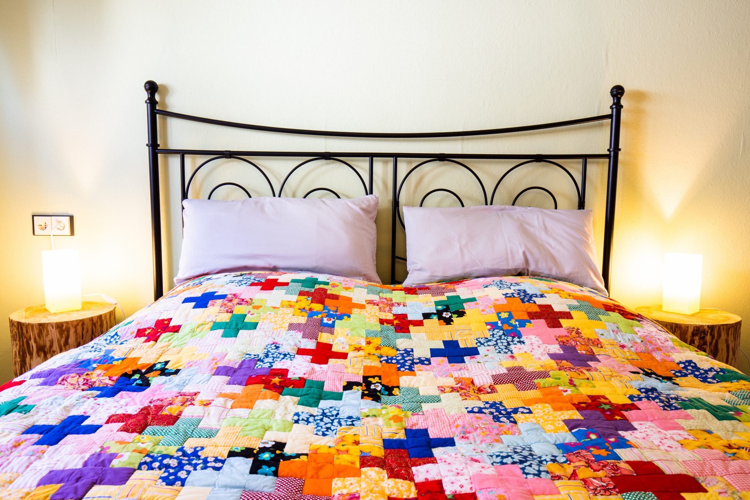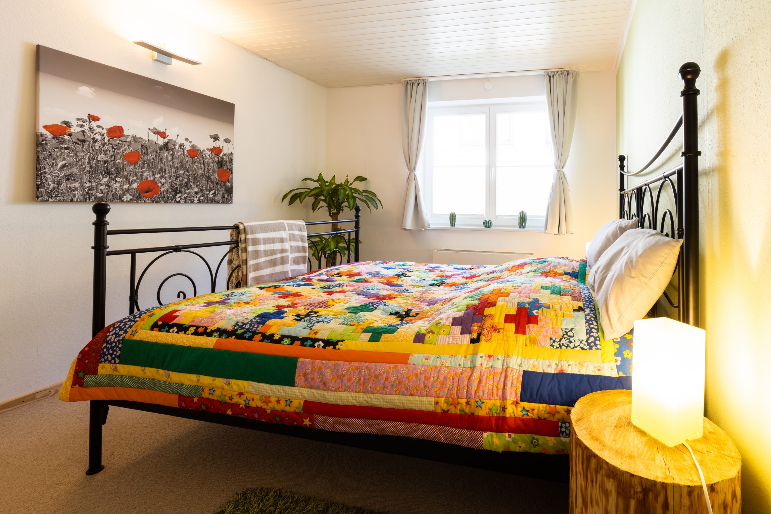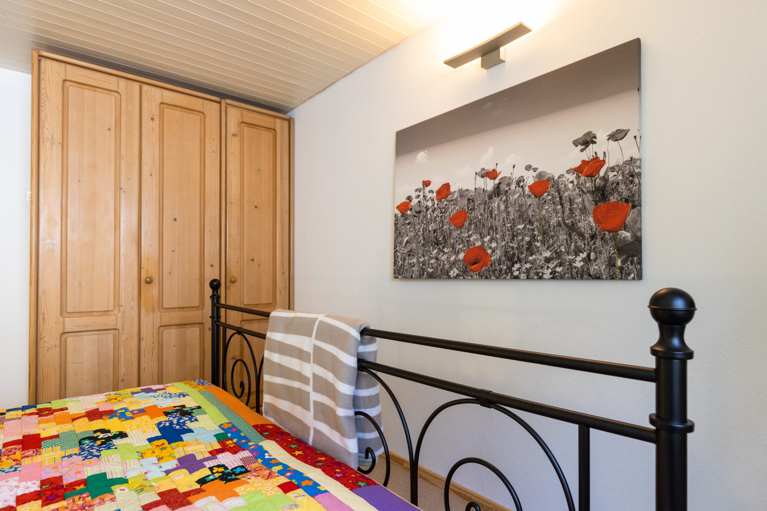 Das Schlafzimmer zeigt Richtung Osten, sodass Sie die Sommer-Sonne bereits am frühen Morgen beim Aufwachen genießen können. Es verfügt über ein großes Doppelbett sowie einen geräumigen Kleiderschrank.