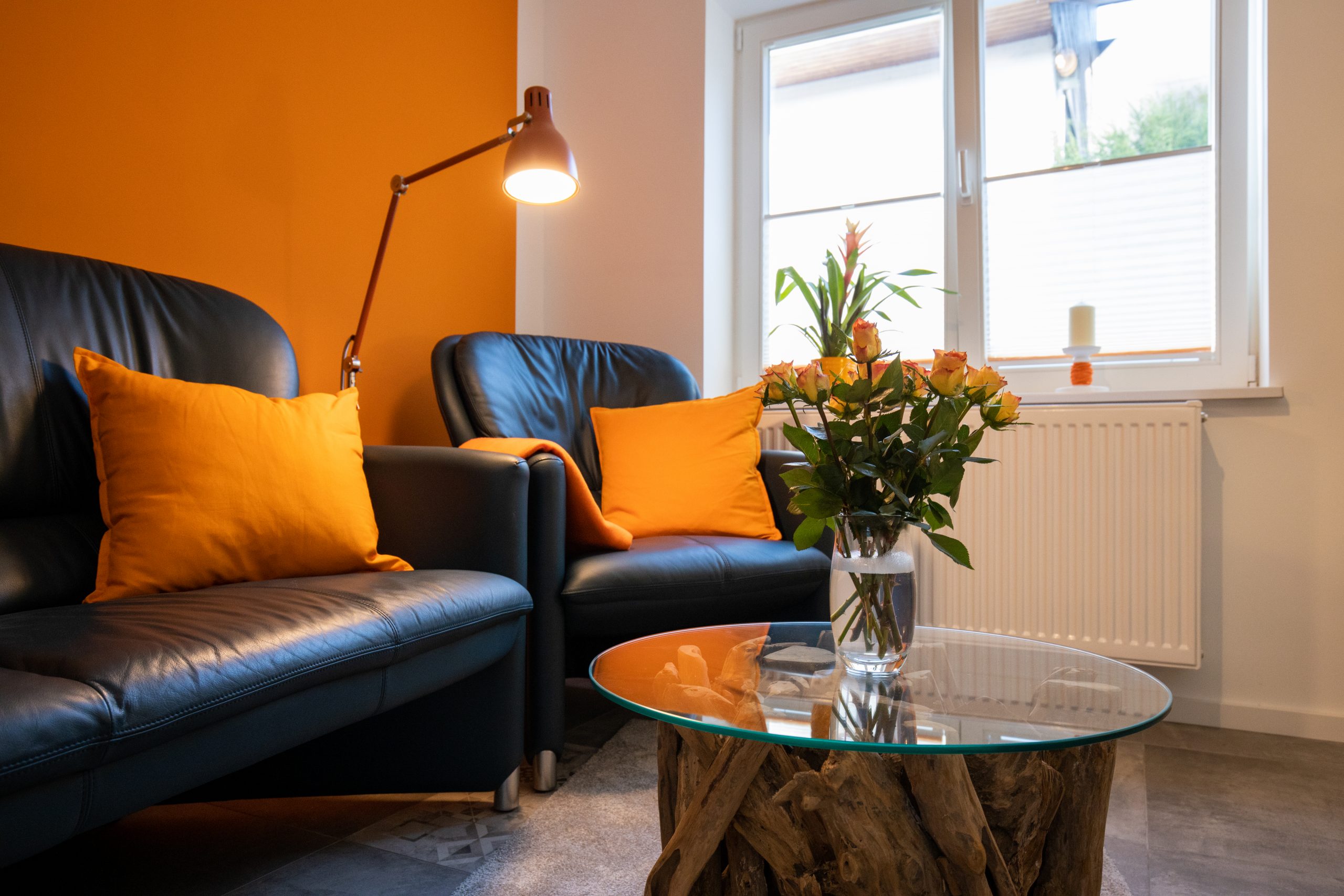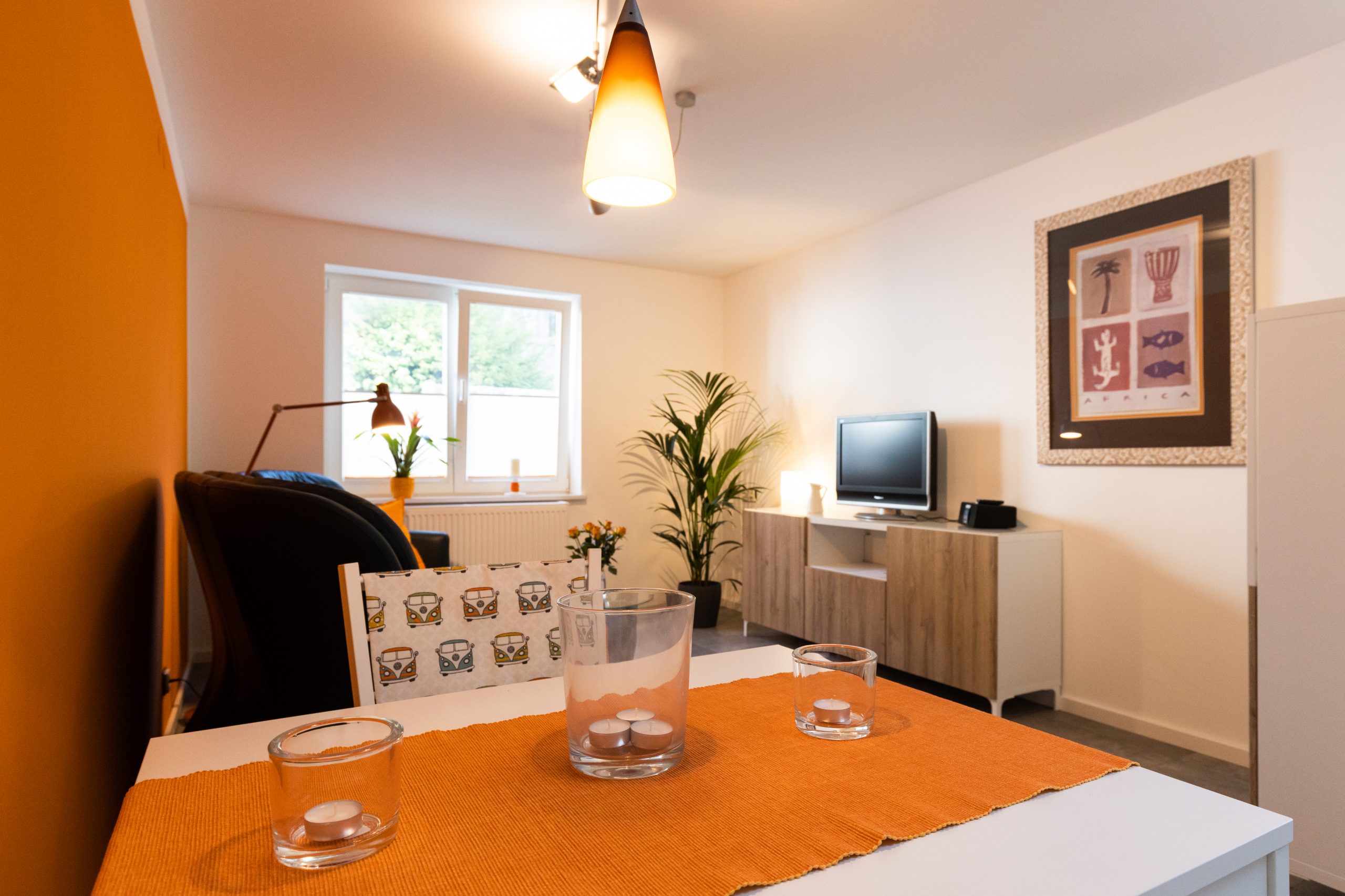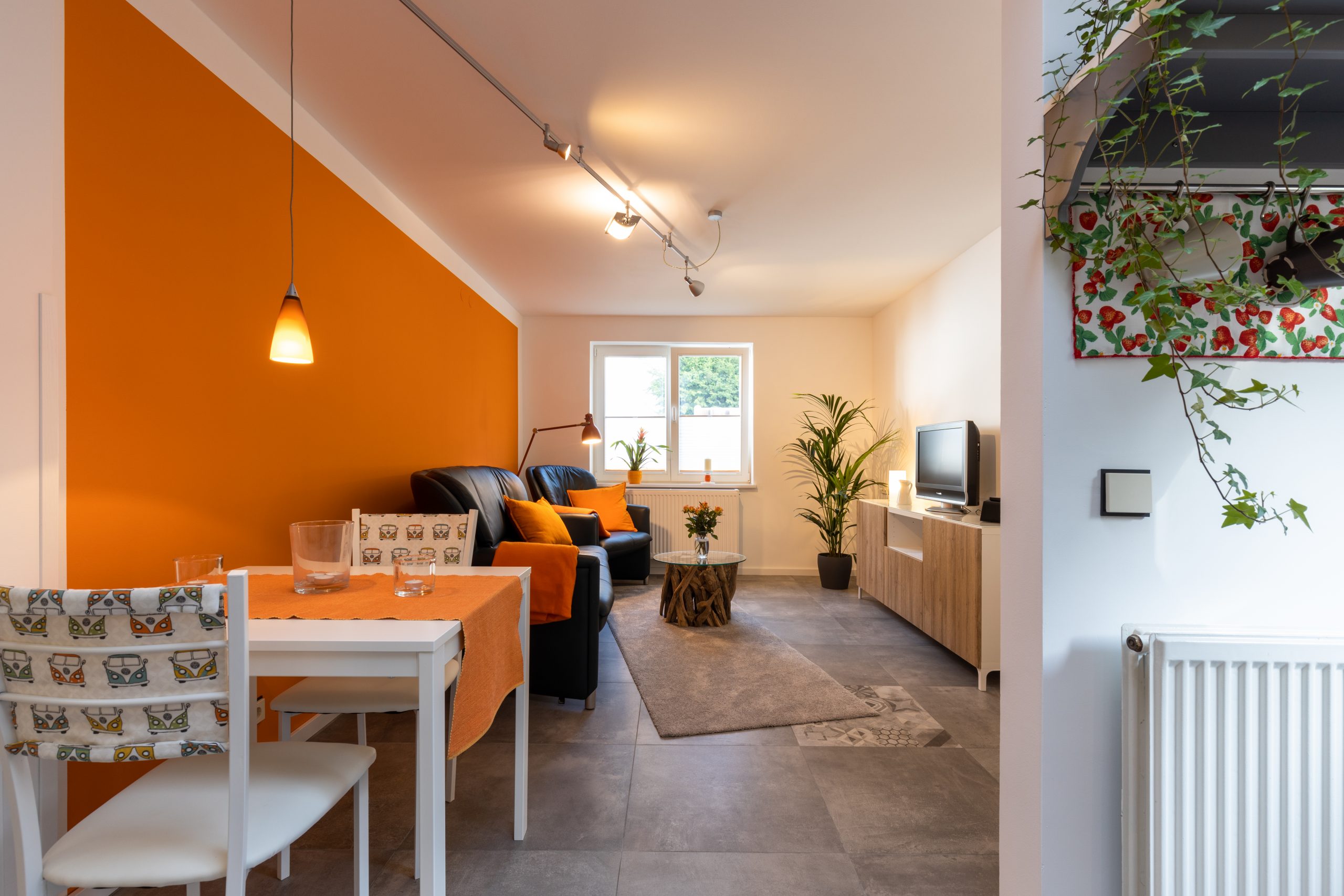 Das Wohnzimmer bietet Ihnen eine Sofaecke mit Leselampe, ein Radio sowie Internet-Fernsehen. Diverse Karten- und Brettspiele sind vorhanden und laden ein zu fröhlichen Spielerunden. Kleine Lämpchen, indirekte Beleuchtung sowie Kuscheldecken runden das gemütliche Ambiente ab. Der Flur bietet Ihnen ausreichend Platz für Garderobe, Schuhe und Taschen. Hier kann auch ein vorhandener Wäscheständer für nasse Kleidung aufgestellt werden. Bewegungsmelder in Diele und Flur ermöglichen es Ihnen, ohne lästiges Suchen und Betätigen der Lichtschalter in Ihre Ferienwohnung zu gelangen.