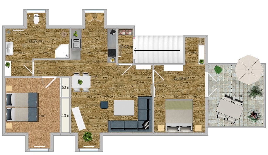 Von diesem Raum gelangen Sie auf Ihre eigene Dachterrasse, die mit Gartenmöbeln ausgestattet ist. Was gibt es Schöneres, als einen Urlaubstag mit einem herrlichen Frühstück im Sonnenschein zu beginnen oder am Abend bei einem Glas Wein den Ausklang des Tages zu genießen? Das zweite Schlafzimmer verfügt über zwei Betten. Ein geräumiger Wandschrank bietet ausreichend Platz für Ihre Wäsche. Im Wohnzimmer steht Ihnen ein großes Ledersofa mit Leselampe, ein Radio sowie Internet-Fernsehen zur Verfügung. Diverse Karten- und Brettspiele sind vorhanden und warten auf fröhliche Spielerunden. Kleine Lämpchen, indirekte Beleuchtung sowie Kuscheldecken runden das gemütliche Ambiente ab. Der Flur bietet Ihnen ausreichend Platz für Ihre Schuhe und Jacken.