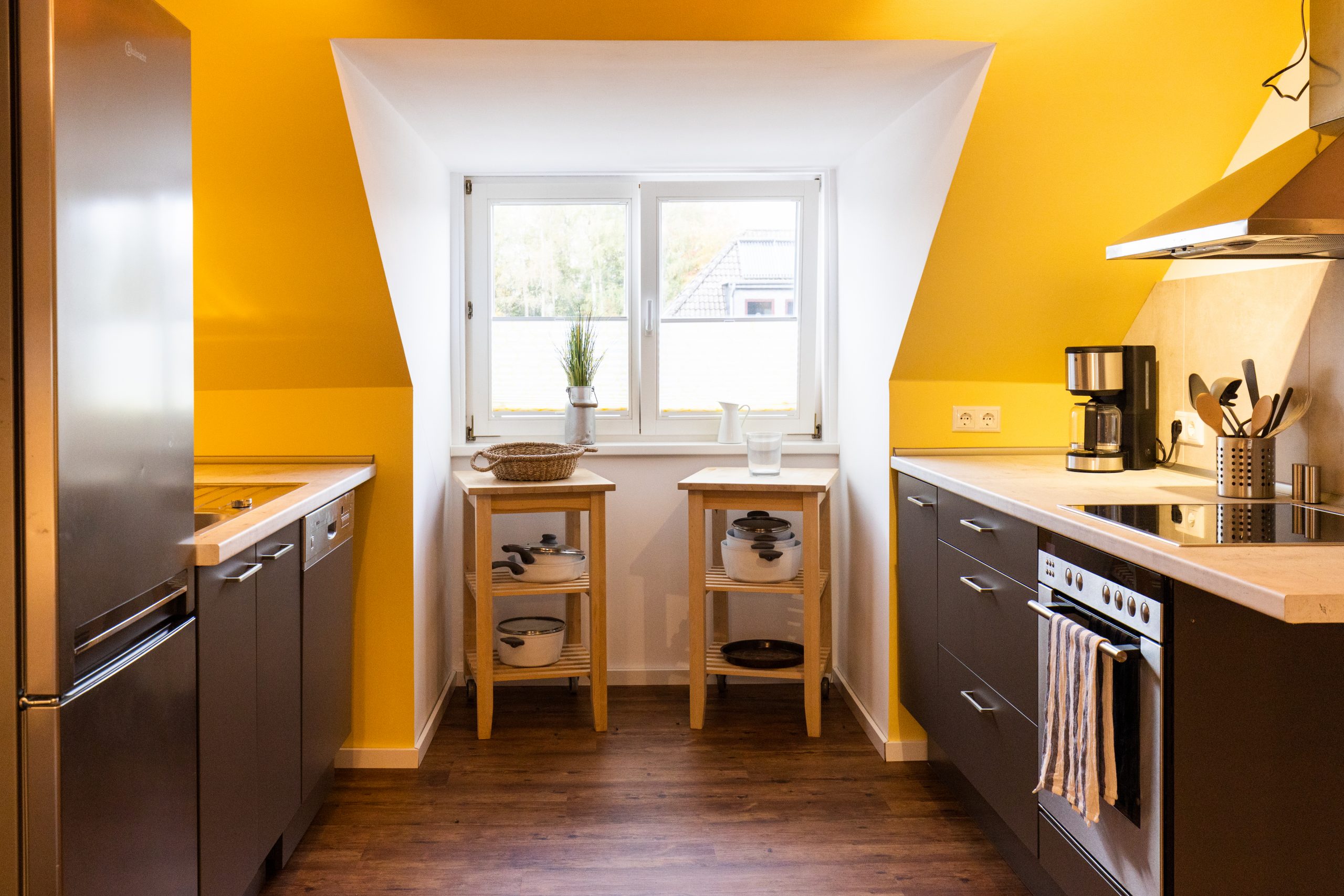 Ein vorhandener Wäscheständer für nasse Kleidung kann hier aufgestellt werden. Die Küche ist vollständig und modern eingerichtet und lädt zum Kochen und gemütlichen Verweilen ein. Ein Schlafzimmer zeigt Richtung Osten, sodass Sie die Sonne im Sommer bereits am frühen Morgen beim Aufwachen genießen können. Es verfügt über ein großes Doppelbett und ausreichende Ablage- und Hängemöglichkeit für Ihre Wäsche.